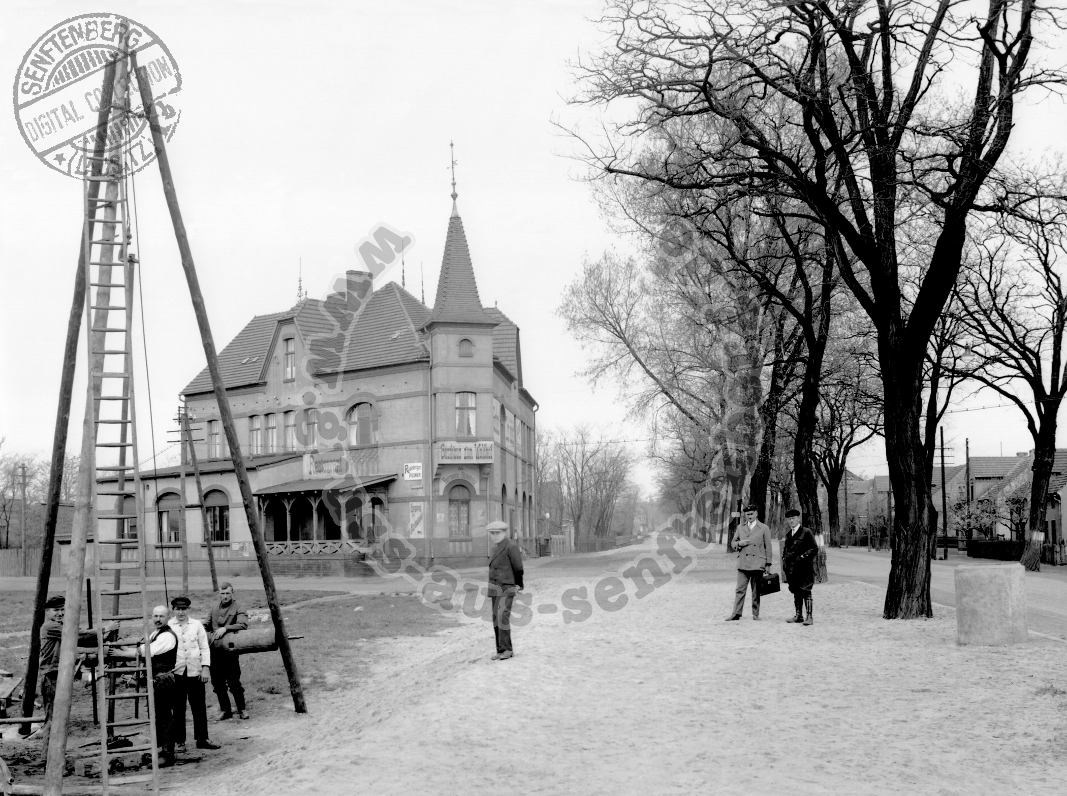 war Schobrick bereits seit 1929. Bei dem Foto stand aber wahrscheinlich weniger das Gasthaus im Fokus sondern vielmehr die Männer der Bohr- und Brunnenbaufirma "Gebrüder Zimmermann". Einer der beiden "Zimmermänner" ist der zweite von rechts. Was genau seine Leute da am Straßenrand veranstalteten, bleibt im Dunkel. |