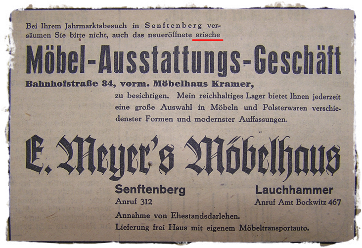 Die Arbeits- und Lebensbedingungen für Juden verschlechterten sich auch in unserem kleinen Städtchen im Laufe des Jahres 1938 immens. Das Ganze steuerte unaufhaltsam auf die allseits bekannte Katastrophe zu... Das Möbelgeschäft Kramer - wie auch das gesamte Haus Bahnhofstraße 34 - gehörte dem jüdischen Kaufmann Max Kramer, der eigentlich in Cottbus beheimatet war wo er ebenfalls ein Möbelgeschäft unterhielt. Nach meinen Recherchen gelang ihm noch 1939 die Emigration nach Bolivien. Sein Geschäft in Senftenberg ging ein Jahr zuvor (siehe oben) sicher zu fabelhaften Konditionen an an den "Arier" Erich Meyer. |