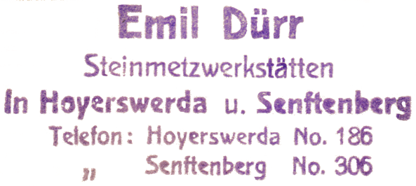 Der Verdacht liegt nahe, daß mein Original irgendwie aus dem Dunstkreis des Steinmetzbetriebes Emil Dürr, der sowohl in Senftenberg wie auch in Hoyerswerda Filialen unterhielt, stammt. Dürr war für die Errichtung des Gedenksteines verantwortlich. Dies wussten wir schon aus der damaligen Berichterstattung des Senftenberger Anzeiger. Und damit endet unsere heutige Wanderung durch das Gebiet von gruss-aus-senftenberg.de. Mal sehen, wohin - und in welche Zeit - es mich in der nächsten Woche verschlägt. |
