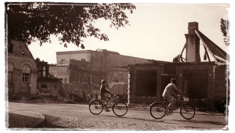Erste Spuren des Rückbaus kann man auch schon auf zwei der von mir hier vorgestellten Fotos erkennen. Das Dach eines Hauses, das zum Passage-Kino gehörte, war zu diesem Zeitpunkt bereits geordnet abgedeckt worden. Nicht zuletzt
