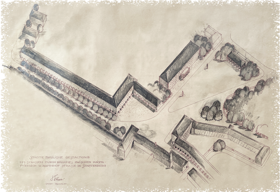 So wie ich den Entwurf interpretiere, wäre die Einbindung in die Bahnhofstraße nicht (wie heute) über die Westpromenade sondern über das Bett der Wolschinka und danach die Annastraße (heute Reyersbachstraße) erfolgt. Die Häuser von Skoring und Petsch ("Passage"-Kino) wären dabei ebenso wie das Städtische Verkehrsamt im Wege gewesen. Das Feurwehrdepot wäre zugunsten eines zentralen Parkplatzes abgeräumt worden. An dessen Westseite sollte ein repräsentatives Gebäude (Zweck unbekannt) entstehen und an seiner Nordseite wohl so ein Zwischending aus Wandelhalle und Buswartehäuschen. Und da das alles noch nicht genug war, wollte Busse gleich noch den Jüttendorfer Anger beidseitig auf links drehen. Der Stadtbaurat aus der Provinz hatte wohl in Hitlers Haus- und Hofarchitekten Albert Speer ein Vorbild gefunden und versuchte in kleinerem Maßstab dessen "Welthauptstadt Germania" - Entwurf abzukupfern. Säulengänge entlang der Kaiser-Friedrich-Straße und sogar bis in die Kreuzstraße hinein. Mein lieber Scholli! Da ist aber der Kelch noch einmal an Senftenberg vorbei gegangen.