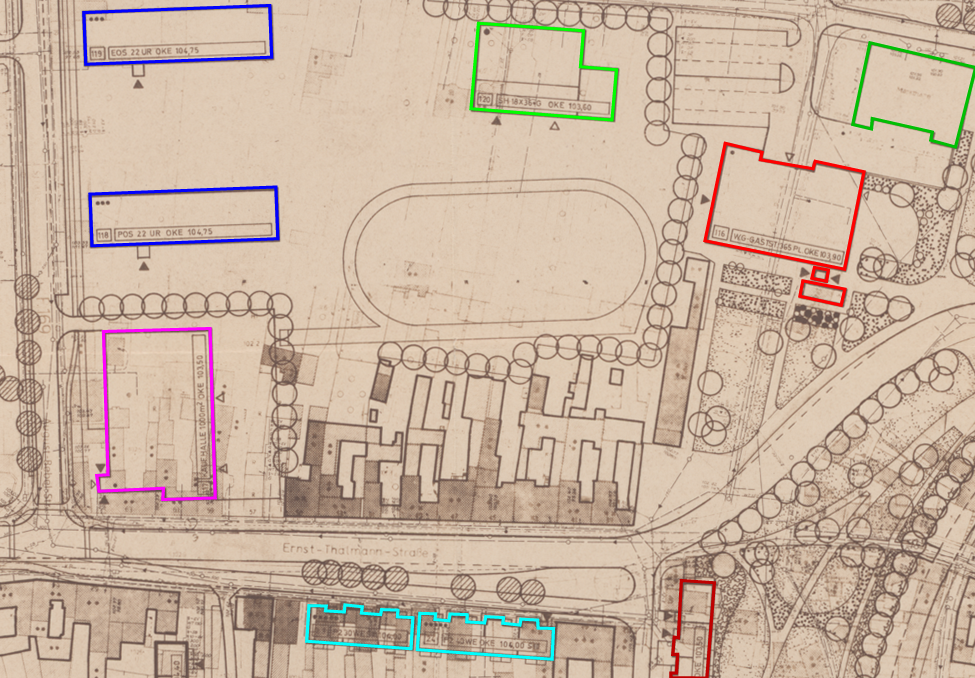 Umbaugelüste hatten aber auch nachfolgende Generationen von Stadtplanern. Ein Entwurf aus dem Juli 1979 (VEB Hauptauftraggeber Komplexer Wohnungsbau des Bezirkes Cottbus) offenbart nur 5 Jahre nach Finalisierung der Straßenbaumaßnahme unter anderem den Drang nach einer großflächigen Umgestaltung des Quartiers nördlich der Ernst-Thälmann-Straße. Geplant waren zwei Schulen (1 x EOS, 1 x POS, blau markiert). Davon wurde nur die POS an einem leicht versetzten Standort (dort wo der Sportplatz eingezeichnet ist) realisiert. Die Sporthalle (hellgrün) wurde ebenfalls - jedoch ein ganzes Stück weiter südlich - aus dem Boden gestampft. Das rot umrandete Gebilde symbolisiert eine sogenannte "Wohngebietsgaststätte". Dafür hätte das alte Feuerwehrdepot geschliffen werden müssen. Nördlich davon - hier als "Markthalle" bezeichnet und mittelgrün markiert - das kennen viele noch als "Vitaminquelle". An der Ecke Ernst-Thälmann-Straße/August-Bebel-Straße (fuchsia markiert): hier sollten diverse Wohnhäuser einer Kaufhalle Platz machen. An der Südflanke der Ernst-Thälmann-Straße wäre dem Plan nach nahezu die gesamte historische Bebauung zwei Neubaublöcken mit insgesamt 70 Wohneinheiten zum Opfer gefallen. Der dunkelrot markierte Neubaublock am unteren Rand des Planes wurde so ähnlich tatsächlich gebaut. Und wieder abgerissen.