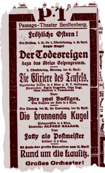 Na da habe ich doch mal wieder sprichwörtlich "die Kurve gekriegt", oder? ![]() Übrigens, bei meinen Recherchen zu den Filmaufnahmen entdeckte ich, daß der Streifen zwischenzeitlich einen sorbisch-/wendischen Anstrich erhalten hat. Er wird in der Filmografie einer Arbeit, die sich grundsätzlich mit dem "Sorbischen Film" auseinandersetzt, aufgeführt. Mit falscher Lauflänge, falschem Produktionsjahr und überhaupt gänzlich verkehrt. Offenbar hat der Verfasser den Film nie gesehen, sonst hätte er den Streifen bestimmt nicht gelistet. Von der Darstellung sorbischen Lebens kann in den gut 12 Minuten keine Rede sein. Nur 5 Tage nach dem Rennsonntag, am 18. April 1924, lief der Film schon im Rahmenprogramm des Senftenberger "Passage-Theaters". Eine Woche darauf auch im Ruhländer "Lichtspiel-Haus". |