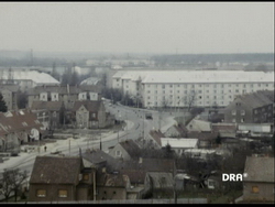 u.a. Aufnahme von Pieck-Kreuzung/Rostocker Straße aus dem Hochhaus gefilmt, Straßenszene in Schwarzheide-Ost, Autobahnabfahrt Ruhland